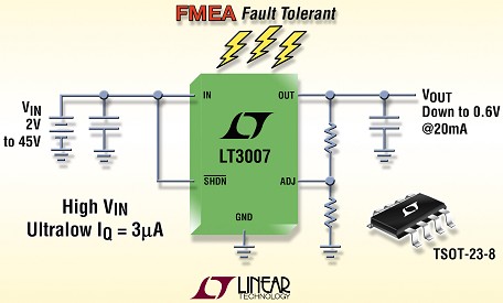 凌力爾特公司(Linear Technology Corporation)推出 LT3007,該器件是一個高壓、微功率、基于堅固 PNP 的 LDO 系列之最新成員,具備 3µA 超低靜態電流。LT3007 具備高輸入電壓能力,電壓范圍為 2.0V 至 45V,并提供范圍為 0.6V 至 44.5V 的可調輸出電壓,能用于種類繁多的應用領域。LT3007 的管腳引出線符合 FMEA (失效模式與影響分析) 驗證標準,在相鄰引腳發生短路或者一個引腳處于浮置狀態時,輸出保持等于或低于穩定電壓。該器件的 3µA 靜態電流和停機電流 (<1µA) 實現了超低備用功耗,使該 IC 成為不需要停機的應用之卓越選擇,或者非常適用于那些需要適度輸出驅動能力和高輸入電壓的應用,例如遠程監視應用以及用于需要延長運行時間的“保持運作”系統之低電流電池供電型存儲器。