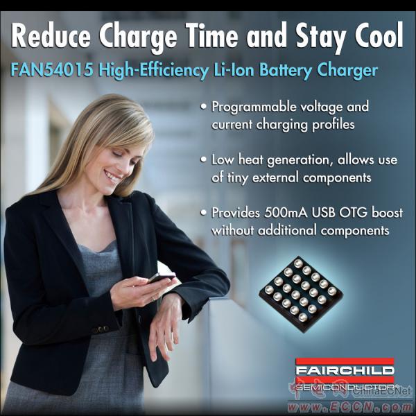 飛兆半導(dǎo)體公司(紐約證券交易所代碼: FCS)的FAN54015是符合USB標(biāo)準(zhǔn)的單節(jié)鋰離子電池開(kāi)關(guān)充電器,可為設(shè)計(jì)人員提供移動(dòng)設(shè)備電池充電的安全性、精度、效率和解決方案尺寸的最佳平衡。