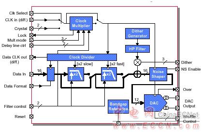 16-bit Interpolating Digital to Analog conversion x1, x2 or x4 interpolation filtering 100MSa/s input, with x4 interpolation enabled Programmable highpass filtered dither Selectable 2nd order noise shaping Versatile CMOS digital interface Internal programmable clock multiplier Low power, 3.3V operation (343mW @32MSa/s input, x4) Performance enhanced pinout with on-chip decoupling 0.35µm CMOS technology with Triple Well Industrial temperature range (-40°C to +85°C)