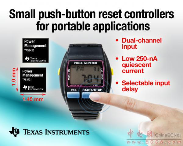 TI宣布面向計步器、健身腕表 (fitness bands)、手機以及平板電腦等空間有限的低功耗應用推出兩款微型按鈕復位控制器。該雙通道 TPS3420 與 TPS3421 功耗低,提供可選復位時間延遲,可增強系統穩定性。