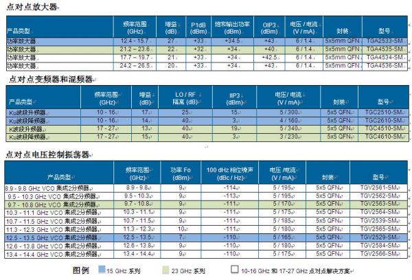 TriQuint本次推出的新產(chǎn)品包括高性能封裝的放大器、上變頻器 / 下變頻器、電壓控制振蕩器 (VCO) 以及其它附加裝置,能夠支持從10 到27 GHz范圍內(nèi)的點(diǎn)對(duì)點(diǎn)射頻需求。