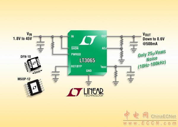 Linear推出高電壓、低噪聲、低壓差線性穩(wěn)壓器 LT3065,該器件可提供精準(zhǔn)、可編程電流限制和電源良好標(biāo)記。LT3065 在滿負載時可傳送高達 500mA 輸出電流和具有一個 300mV 壓差。該器件具有 1.8V 至 45V 的寬輸入電壓范圍,輸出電壓在 0.6V 至 40V 范圍內(nèi)可調(diào)。單個 REF/BYP 引腳電容器實現(xiàn)低噪聲工作,在 10Hz 至 100kHz 帶寬內(nèi)僅為 25µVRMS,還提供了基準(zhǔn)軟啟動功能,從而在接通時防止輸出電壓過沖。輸出電壓容限非常準(zhǔn)確,在整個電壓、負載和溫度范圍內(nèi)為 ±2%。