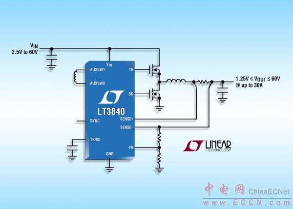 當在無負載惰況下調節輸出電壓時,LT3840 僅吸取 75µA,從而延長了電池供電應用的運行時間。輸出電流可高達 30A 而輸出電壓可設定在 1.25V 至 60V 范圍,效率則高達 95%,這使該器件非常適用于 12V 或 24V 汽車、重型設備、工業控制、機器人以及電信應用。運用 LT3840 的可編程電流限制能夠實現準確的電流調節,同時電流監視功能報告平均輸出電流。在輕負載時,用戶可以選擇連續工作、脈沖跳躍和低紋波突發模式 (Burst Mode®) 工作。