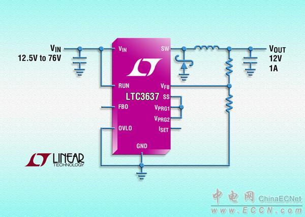 Linear推出能接受 76V 輸入的高效率降壓型轉換器 LTC3637,該器件可提供高達 1A 的連續輸出電流。它在 4V 至 76V 的輸入電壓范圍內工作,非常適用于電信、工業、航空電子和汽車應用。LTC3637 運用可編程峰值電流模式設計,在很寬的輸出電流范圍內優化效率。該器件提供高達 90% 的效率,僅需要 12µA 靜態電流,最大限度地延長了電池運行時間。用戶可編程輸出電流限制可按照應用需要,在 100mA 至 1A 范圍內設定輸出電流。LTC3637 可用 1.8V、3.3V 或 5V 固定輸出電壓設定,還可以用電阻分壓器設定輸出在 VIN 至 0.8V 范圍內。LTC3637 的耐熱增強型 MSOP 或 3mm x 5mm DFN 封裝提供高壓輸入所需的額外引腳間隔。該器件采用 MSOP 或 DFN 封裝,僅需要四個纖巧的外部組件就可構成適用于多種應用以及占板面積非常緊湊的解決方案。