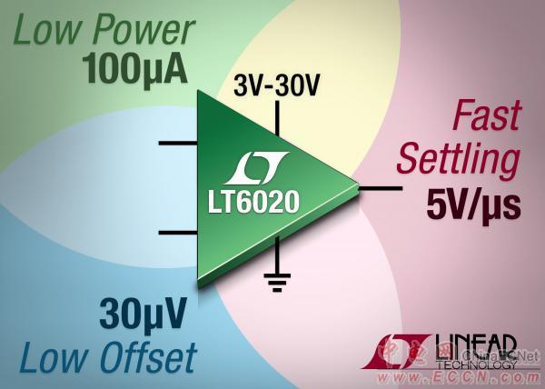 Linear推出 3V 至 30V 快速穩定雙路運算放大器 LT6020,該器件具備 30µV 最高輸入失調電壓和 0.5µV/°C 最大 VOS 漂移。雖然每個放大器的電源電流只有 100µA (最大值),但專有的擺率增強電路可提供快速干凈的輸出階躍響應。不管輸出階躍是 5V 還是 25V,LT6020 都能在不到 15µs 的時間里穩定至 0.0015%。特別設計的輸入電路維持了高阻抗,從而最大限度地抑制了由于快速階躍而引起的電壓尖峰 (針對高達 5V 的輸入階躍)。所有這些特性使得 LT6020 非常適合于高精度多路復用數據采集系統、DAC 緩沖器應用和便攜式高精密儀器。