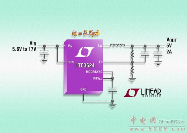 照片說明:17V、2A 同步降壓型穩壓器僅需 3.5µA 靜態電流 |