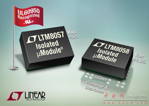 Linear推出 1.5W 輸出 µModule® ( 微型模塊) DC/DC 轉換器 LTM8057 和 LTM8058,這兩款器件提供 2kV AC 電氣隔離 (生產測試至 3kV DC),采用 9mm x 11.25mm x 4.92mm BGA (球珊陣列) 封裝。LTM8057 和 LTM8058 含有一個隔離式變壓器、控制電路、功率開關和容量適度的輸入及輸出電容。這兩款 µModule 轉換器是經過 UL60950 認證的組件,符合 #464570 文件要求。兩款器件都在 3.1V 至 31V 的輸入電壓范圍內工作,在副邊提供穩定的輸出電壓,電壓可調在 2.5V 至 12V (LTM8057) 和 1.2V 至 12V (LTM8058) 范圍。LTM8058 含有一個低噪聲線性后置穩壓器,在 300mA 時將輸出紋波降至 20µVRMS。在等級 2 污染環境*中,爬電距離和電氣間隙支持高達 250V 工作電壓,以在測試儀器、服務器、工業自動化、控制以及伺服系統中斷開接地環路。