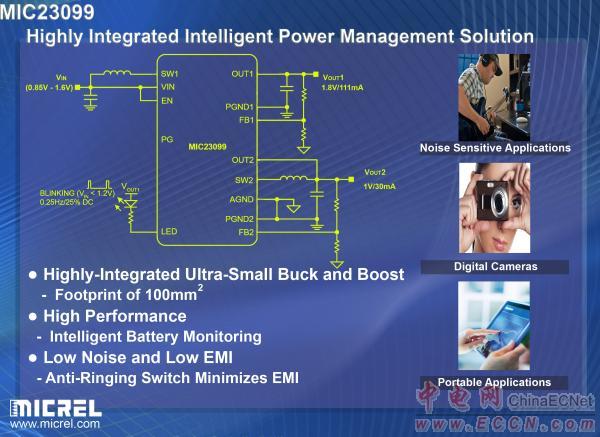 麥瑞半導體負責高性能線性和電源解決方案營銷的副總裁Brian Hedayati表示:“MIC23099是高性能、高集成度電源管理解決方案,解決了對噪聲敏感和空間有限的便攜式應用的技術難題。該器件將整個解決方案的尺度縮小了40%以上,內(nèi)置的智能電源監(jiān)測功能進一步降低了系統(tǒng)設計的復雜性。”