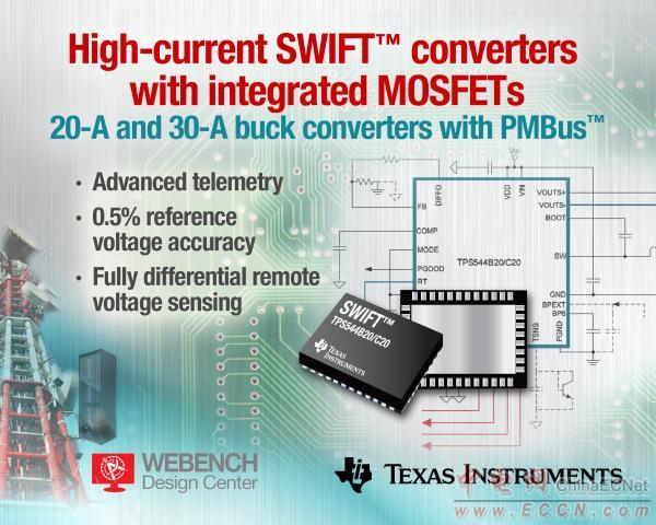 TI宣布推出業(yè)界首批具有 PMBus 接口的 18V、20A 及 30A 同步 DC/DC 降壓轉(zhuǎn)換器。該 SWIFT TPS544B20 及 TPS544C20 轉(zhuǎn)換器采用小型 QFN 封裝并支持集成型 MOSFET,可在空間有限的高功率密度應(yīng)用中驅(qū)動ASIC,能夠充分滿足有線及無線通信、企業(yè)與云計算以及數(shù)據(jù)存儲系統(tǒng)等不同市場的需求。這些轉(zhuǎn)換器與 TI 屢獲殊榮的 WEBENCH® 在線設(shè)計工具配合使用,可簡化電源轉(zhuǎn)換,加速電源設(shè)計進(jìn)程。