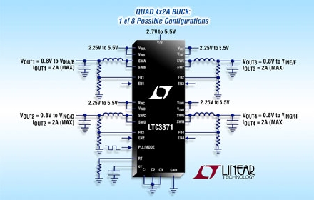 Linear推出高度集成的通用型電源管理解決方案 LTC3371,以用于需要多個低壓電源的系統(tǒng)。該器件具有四個同步降壓型轉(zhuǎn)換器,各由獨(dú)立的 2.25V 至 5.5V 輸入供電,而且均可通過配置以共享 8 個可用 1A 功率級中的最多 4 個。利用 8 種獨(dú)特的輸出電流配置,LTC3371提供了實(shí)質(zhì)的靈活性以及容易重復(fù)使用于不同應(yīng)用中。該器件是多種多通道工業(yè)、汽車、通信和分布式電源系統(tǒng)的理想選擇。