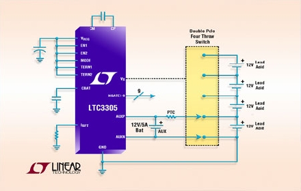Linear推出單片、獨立多節電池平衡器 LTC3305,該器件適用于 12V 鉛酸電池。平衡是通過以下方式實現的:從電壓較高的電池吸取電荷,并將這些電荷傳送到電壓較低的電池,以使電池充電至相同電量。這些電荷是用一個容量較低的電池傳送的,該電池依次連接電池組上的電池。這個電池不僅傳送電荷,該電池中的能量也加到電池組的總能量中,從而增加了容量。該芯片還包括排序、面向外部高壓 NFET 的驅動電路、電壓監視和保護功能。LTC3305 為獨立工作而設計,不需要微處理器或其他控制電路。有了 LTC3305,就可以更換電池組的電池,而且新更換的電池還能與電池組的其他原有電池快速平衡。LTC3305 非常適合電信備份系統、家用電池供電備份系統、電動汽車和工業照明系統等應用。