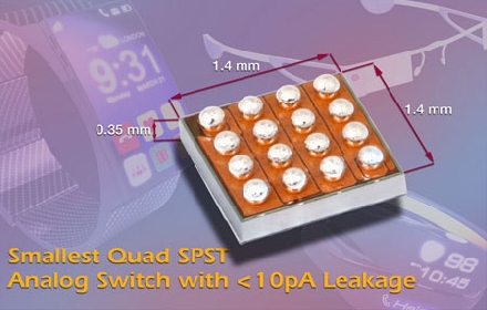 今天推的開關尺寸為1.4mm x 1.4mm,節距0.35mm,采用頂側疊層以提高耐用性,比最接近的競爭器件小50%,比采用標準QFN16封裝的器件小95%。DG2501、DG2502和DG2503尺寸較小,不到0.01μW的典型功耗可延長電池壽命,非常適合模擬前端的信號開關、可編程增益控制、采樣保持電路,以及智能手表、醫藥貼、健身監測、傳感器和其他構成物聯網(IoT)的類似產品里的多路模擬輸入復用。