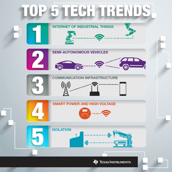 在迎接2015到來之際,我們有必要花時(shí)間來評(píng)估和預(yù)測(cè)未來的一年中將會(huì)出現(xiàn)的技術(shù)挑戰(zhàn)和突破創(chuàng)新。通過與眾多戰(zhàn)略客戶、大學(xué)合作伙伴以及TI產(chǎn)品線的技術(shù)專家進(jìn)行探討后,我們認(rèn)為TI將在一些重要技術(shù)趨勢(shì)中發(fā)揮戰(zhàn)略性作用。這些技術(shù)趨勢(shì)正推動(dòng)著汽車和工業(yè)等多個(gè)市場(chǎng)的發(fā)展,而在此過程中,TI的工程師將幫助應(yīng)對(duì)半導(dǎo)體技術(shù)領(lǐng)域的獨(dú)特挑戰(zhàn),并利用先進(jìn)技術(shù)改善我們的生活。