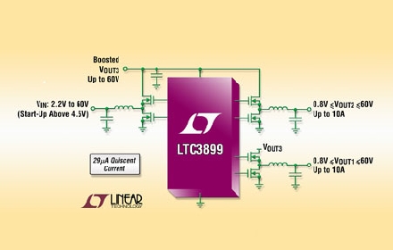 Linear推出三輸出 (降壓、降壓、升壓) 29µA 靜態電流、同步 DC/DC 控制器 LTC3899,該器件在 2.2V 至 60V 輸入范圍內保持輸出電壓穩定。12V 汽車電池在引擎重新啟動或冷車發動時可能降至低于 4V,從而導致信息娛樂系統以及其他采用 5V 或更高電壓工作的電子系統復位。升壓型轉換器為兩個降壓型轉換器供電,從而在汽車電池電壓下降時避免了輸出電壓下降,在怠速時關閉引擎以節省燃料的汽車啟/停系統中,這是一種非常有用的功能。60V 最高輸入電壓涵蓋雙電池卡車應用。或者,降壓型控制器可由輸入供電以用作通用的三路輸出控制器。