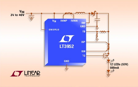 LT3952 可用標稱的 12V 輸入驅動多達 16 個 350mA 白光 LED,從而提供超過 15W 功率。該器件包括高壓側電流檢測,允許其以升壓模式、降壓模式、降壓-升壓模式或 SEPIC 拓撲工作。內部的擴展頻譜頻率調制最大限度減輕了 EMI 問題。LT3952 在升壓拓撲時提供超過 94% 的效率,因此無需外部散熱措施。其內部 LED 短路保護在大多數應用中實現了更高的可靠性。頻率調節引腳允許用戶設定開關頻率在 200kHz 至 3MHz,從而優化了效率,同時最大限度減小了外部組件尺寸和成本。LT3952 在纖巧的解決方案占板面積提供了超過 90% 的效率,同時以 2MHz 頻率切換。該器件采用耐熱增強型 TSSOP-28E 封裝,提供了非常緊湊的大功率 LED 驅動器解決方案。