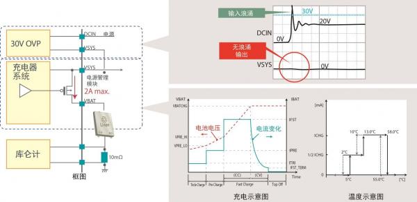 另外,當不選擇電池供電,而選擇外部供電裝置供電時,有時會出現意外的浪涌電壓。作為其對策,本產品內置過電壓保護電路,可抗30V以內的浪涌電壓,保護元器件不受損壞。此外,可輕松保護連接VSYS端子的各種設備(IC),將實現安全的電源系統。
