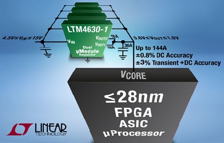 Linear推出雙路 18A 或單路 36A 微型模塊 (µModule®) 穩壓器 LTM4630-1,該器件具高精確度輸出電壓調節,面向 28nm 和低于 28nm 的 FPGA、ASIC 和微處理器。這些先進數字器件的內核電壓在穩態 (DC) 和快速負載電流瞬態時需要非常準確的電壓調節。LTM4630-1 針對兩種情況提供了精確的輸出電壓調節:(a) 在電壓、負載和溫度 (–40°C 至 125°C) 變化范圍內的最大總 DC 誤差為 ±0.8%;(b) 采用最少輸出電容并包括瞬態在內的總誤差為 ±3%。為了給 28nm 和低于 28nm 的中到大功率數字器件供電,LTM4630-1 可并聯使用,以均分高達 144A 的電流 (例如:4 個器件 x 36A)。LTM4630-1 在 16mm x 16mm x 5.01mm BGA 封裝內包括了一個 DC/DC 穩壓器、若干電感器和 MOSFET。