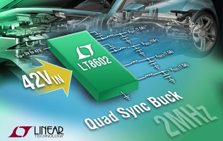 Linear推出可達 42V 輸入、高效率、四輸出同步單片降壓型開關穩壓器 LT8602。該器件的 4 通道設計整合了高壓 2.5A 和 1.5A 兩個通道以及兩個較低電壓的 1.8A 通道,以提供 4 路獨立輸出,從而可提供低至 0.8V 的電壓。其同步整流拓撲提供高達 93% 的效率,同時突發模式 (Burst Mode®) 工作在無負載備用情況下保持靜態電流低于 30µA (所有通道),從而使該器件非常適合始終保持接通的系統。就噪聲敏感型應用而言,LT8602 運用其脈沖跳躍模式工作以最大限度降低開關噪聲,并滿足 CISPR25 Class 5 EMI 要求。開關頻率可設定在 250kHz 至 2.2MHz 范圍,并可在這個范圍內同步。