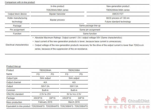 大量生產TBD62064A系列產品計劃開始在TBD62308A系列產品2016年二月出貨樣品從今天開始,已具備大批量生產將于2016年三月。