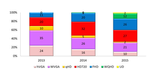 FHD(Full High Definition)即全高清,分辨率可以達(dá)到1920x1080。隨著消費(fèi)者對(duì)手機(jī)分辨率的要求不斷提升,一度占據(jù)手機(jī)市場(chǎng)主流的WVGA分辨率逐漸被HD720(1280x720)和FHD取代,手機(jī)屏幕分辨率跨入全高清時(shí)代(如上圖)。