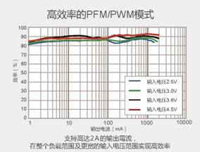 該模式在負載變動時可自動切換PFM和PWM,從而在整個負載范圍內可實現達90%的高效率。非常適用于智能手機和平板電腦等工作切換頻繁、重視效率的應用。
