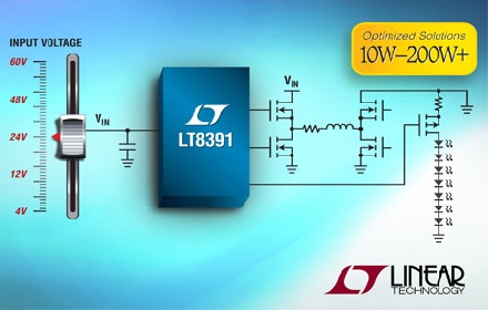 照片說(shuō)明:60V 輸入 / 輸出、同步降壓-升壓型 LED 驅(qū)動(dòng)器提供高達(dá) 100W 以上的 LED 功率