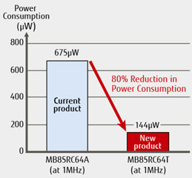 該產品采用I2C接口,能以1.8V至3.6V的電源電壓及最高3.4 MHz的頻率運行。其主要特性是運行時的極低平均電流(3.4 MHz時為170 μA;1 MHz時為80 μA)。與現有的富士通產品相比,其運行功耗降低近80%(圖2),為64 Kbit FRAM實現業界最低的運行功耗。