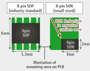 除了業界標準8引腳SOP之外,該產品還提供小型8引腳SON版本,其安裝面積約為SOP的20%(圖3);安裝體積則為SOP的8%,適用于需要小型化的應用。
