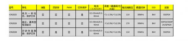 表1:恒流驅(qū)動(dòng)ICN2025/26/28性能對(duì)比。