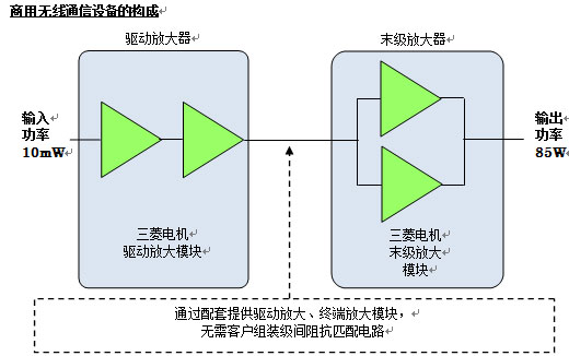 ・通過配套提供驅動放大、末級放大模塊,無需客戶設計組裝級間阻抗匹配電路,有助于商用無線通信設備開發的高效化