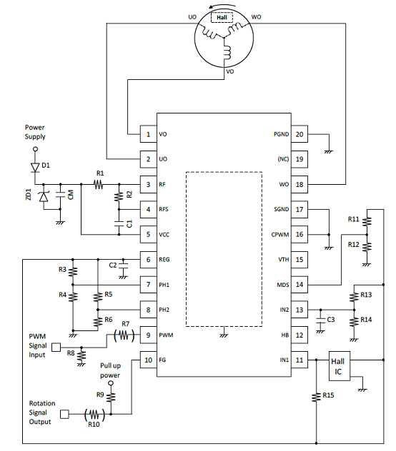 圖3.采用一個霍爾傳感器的LV8811G/13G三相BLDC馬達驅動電路圖(2)