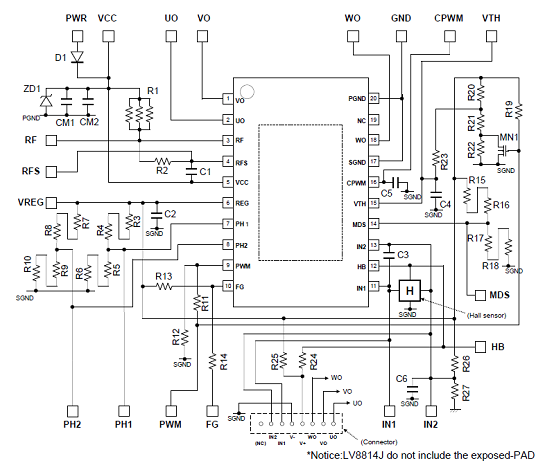 圖2.采用一個霍爾傳感器的LV8811G/13G三相BLDC馬達驅動電路圖(1)
