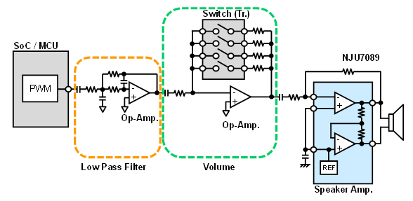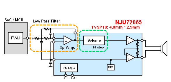 并且,在NJU72065的輸入端內(nèi)置有運(yùn)放,不光能輸入模擬音頻信號(hào),還可以靈活對應(yīng)MCU輸出的PWM信號(hào)。
