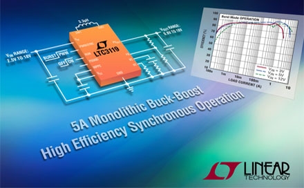 Linear推出同步電流模式單片降壓-升壓型轉換器 LTC3119,該器件在降壓模式提供高達 5A 連續輸出電流,可以使用多種輸入電源,包括單節或多節電池、未調節的交流適配器以及太陽能電池板和超級電容器。一旦啟動,該器件的 2.5V 至 18V 輸入電壓范圍可擴展到低至 250mV。輸出電壓在輸入高于、低于或等于輸出時可穩定,并可設定在 0.8V 至 18V 范圍。用戶可選的突發模式 (Burst Mode®) 運作將靜態電流降至僅為 35µA,從而提高了輕負載時的效率,同時延長了電池運行時間。LTC3119 采用專有的 4 開關 PWM 降壓-升壓型拓撲,在所有工作模式下可提供低噪聲和無抖動切換,因此非常適合對電源噪聲敏感的 RF 和高精確度模擬應用。該器件還包括可編程的最大功率點控制 (MPPC) 功能,從而在使用具高輸出阻抗或光伏電池時,可確保從電源提供最大功率。