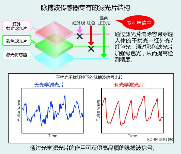 “BH1790GLC”利用ROHM的傳感器技術優勢,采用非常適合脈搏檢測的符合綠色光波長的光電二極管,同時感光部采用綠色光的濾光片和紅外(IR)截止濾光片相結合的脈搏傳感器專有的濾光片結構。因此,