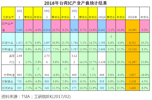 根據工研院IEK統計,2016年臺灣IC產業產值達新臺幣24,493億元(5280.94億元人民幣),較2015年成長8.2%。其中IC設計業產值為新臺幣6,531億元(1408.15億元人民幣),較2015年成長10.2%;IC制造業為新臺幣13,324億元(2872.729億人民幣),較2015年成長8.3%,其中晶圓代工為新臺幣11,487億元(2476.71億人民幣),較2015年成長13.8%,內存制造為新臺幣1,837億元(396.08億人民幣),較2015年衰退16.8%;IC封裝業為新臺幣3,238億元(698.15億人民幣),較2015年成長4.5%;IC測試業為新臺幣1,400億元(301.85億人民幣),較2015年成長6.5%。