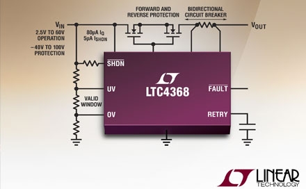 Linear推出電路保護控制器 LTC4368,在電池供電式汽車、工業和便攜式系統中,該器件可針對 2.5V 至 60V 電子線路確保安全的電壓和電流水平。LTC4368 能替代熔斷器、瞬態電壓抑制器和分立電路,從而實現一種用于避免電子線路遭受有害的過流以及過壓、欠壓和反向電壓狀況之損壞的緊湊和全面型解決方案。LTC4368 控制背對背 N 溝道 MOSFET 以在正常操作期間提供一條低損耗電流通路,當發生正向或反向過流故障時則把它們關斷。LTC4368-1 電路斷路器提供對稱的正向和反向電流門限,以保護電池免遭過大的充電和放電電流的損壞。LTC4368-2 電路斷路器在檢測到反向電流時跳變,以防止反向饋電并保持輸出。