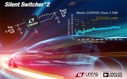 不久前收購了凌力爾特公司 (Linear Technology Corporation) 的亞德諾半導體 (Analog Devices, Inc.,簡稱ADI) 宣布推出 6A、42V 輸入同步降壓型開關穩壓器LT8640S。其獨特的 Silent Switcher® 2 架構采用兩個內部輸入電容器以及內部 BST 和 INTVCC電容器,以最大限度減小熱環路面積。結合非常良好受控的開關邊沿和一種具有整體接地平面的內部構造,并采用銅柱代替了接合線,LT8640S 的設計大幅度地降低了 EMI / EMC 輻射。這種改善的 EMI / EMC 性能不容易受到電路板布局的影響,從而簡化了設計和降低了風險,即使在使用兩層 PC 板時也不例外。LT8640S 在其整個負載范圍內采用一個 2MHz 開關頻率,能夠輕松地滿足汽車 CISPR25 Class 5 峰值 EMI 限制要求。另外,還可使用擴展頻譜頻率調制以進一步降低 EMI / EMC 輻射水平。