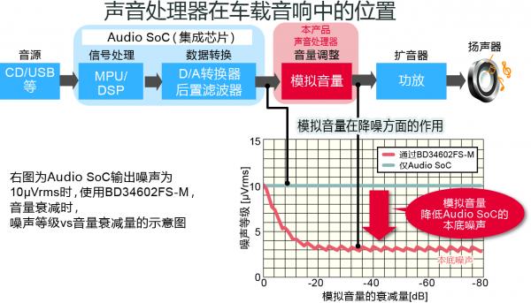 另一方面,音響用SoC*4)作為車載音響的核心,隨著制造工藝的微細化發展而呈現低電壓趨勢,可處理的音頻信號變小,本底噪聲相對增加。這個課題的解決方法要求在SoC的后段具備低噪聲且高音質的模擬音量。