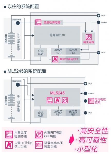 作為其應對措施,以往是通過對電池監控LSI增加外圍電路的形式來確保電池組的安全,而新開發的ML5245集成了這些外圍電路功能,從而可實現系統的小型化與更高可靠性,并進一步提高電池組的安全性。