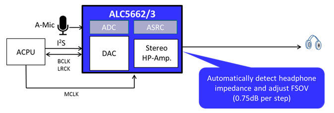 相較于其他耳機音頻解決方案,ALC5662/ALC5663提供高規格的音樂質量,總諧波失真加噪音(THD+N)小于等于負100dB,訊噪比(SNR)小于等于負124dB,串音干擾(crosstalk)小于等于負100dB,而且耳機放大器端可以輸出2Vrms,可支持高阻抗耳機(250Ohm~600Ohm)的完美聆聽感受。除此之外,本解決方案可進一步進行智能耳機偵測,其中包含:耳機(3 segment)/耳麥(4 segment)辨識、10階耳機阻抗偵測(0Ohm ~50kOhm)、耳麥的4個按鈕控制(Android Wired Audio Headset Specification v1.1)以及支持OMTP/CTIA兩種腳位輸出(pinout)的耳麥。