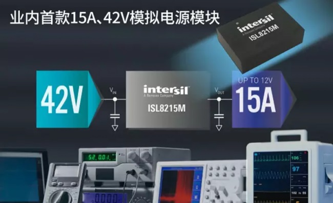 瑞薩電子株式會社(TSE: 6723)子公司Intersil今天宣布,推出業內首款42V單通道DC/DC步降電源模塊ISL8215M,可提供高達15A的持續電流。該模塊可在單一寬輸入電壓范圍中運行,包括工業標準的12V、18V和24V中間總線電源軌。它提供0.6V - 12V可調節輸出電壓、60mA/mm2的最高功率密度,封裝尺寸僅為13mm x 19mm。其96.5%的峰值效率為工業、醫療、RF通信、汽車電子、以及使用鋰離子電池的便攜式設備中的FPGA、DSP和MCU提供優異的負載點轉換性能。