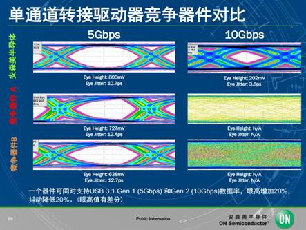 在安森美半導體的完整方案中,有這樣一個器件叫“轉接驅動器”,這個器件究竟起到了什么作用呢?李先生說到,在數據傳輸方面,USB Type-C可以取代通用接口如VGA、HDMI等不同標準,在USB3.0和Type C環境下傳輸速率可達到5Gbps或10Gbps,這便需要用到轉接驅動器來減少碼間串擾,防止不想要的信號失真而影響傳輸,以符合USB3.0X眼圖高度和總抖動規范。相比市場上其它同類產品,安森美半導體一個器件可同時支持USB3.15Gbps和10Gbps的數據率,眼高增加20%,抖動降低20%。而其它方案僅支持5Gbps,且眼高和抖動方面都不及安森美半導體。另外,USB線纜越長,信號會越弱,在線里增加轉接驅動器后,可用來增強信號的性能。換句話說,線纜長度和性能將推動對轉接驅動器和高質量互聯的需求。