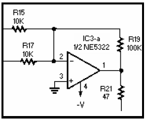 預放大電路是一個運放電路,并不對音頻做反向處理,看起來像預放大。這個電路是必須的,因為這個噪音的音頻信號從麥克風過來之后非常微弱,必須經過放大,才可以使用。預放大的增益由R8和R6的比值決定,通過改變這兩個電阻值可以控制音頻信號的幅度,這個信號將被送入相位反轉電路。