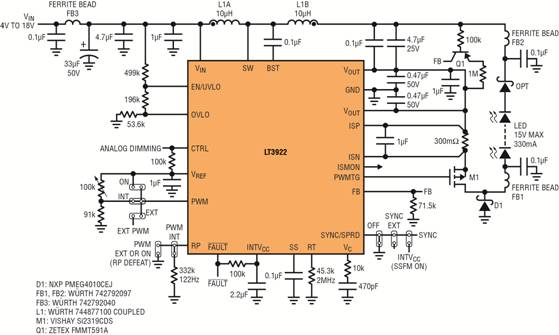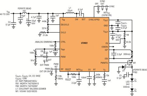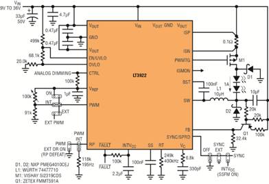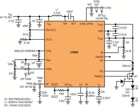 LT3922 具集成式開關(guān)和內(nèi)部 PWM 調(diào)光能力