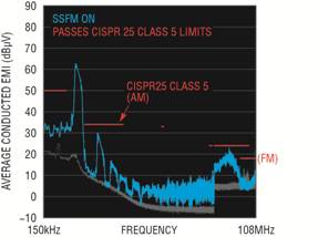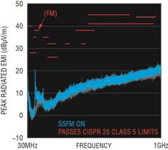 LT3922 的 SSFM 以 1.6kHz 的速率將電阻器設(shè)定的、400kHz 轉(zhuǎn)換器之開關(guān)頻率范圍從 100% 向上和向下擴展為 125%。這降低了轉(zhuǎn)換器在低頻和高頻時的峰值 EMI 和平均 EMI。通過將 SYNC/SPRD 引腳分別連至INTVcc或 GND,可以非常容易地接通或關(guān)斷這功能。