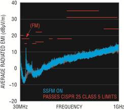 圖 4 所示的 400kHz 汽車用升壓型 LED 驅(qū)動器通過了 CISPR 25 Class 5 EMI 測試,如圖 5 所示,圖中顯示了 LT3922 的傳導(dǎo)和輻射 EMI 測試結(jié)果以及 Class 5 EMI 限制。這是 LT3922 各項低 EMI 特性相結(jié)合所得到的結(jié)果,包括但不限于受控的開關(guān)波形邊沿和SSFM。當(dāng)然,恰當(dāng)?shù)牟季趾蜕倭胯F氧體珠濾波 (FB1 和 FB2) 也要使用,以獲得最佳 EMI 結(jié)果。