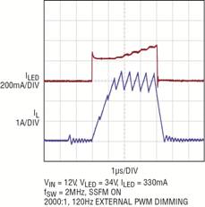 圖 1:2MHz 常規(guī)升壓型拓?fù)湓韴D,120Hz、2000:1 PWM 調(diào)光比