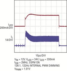 圖 2:以 1000:1、100Hz PWM 調(diào)光進(jìn)行亮度控制的 400kHz 降壓模式 LED 驅(qū)動器