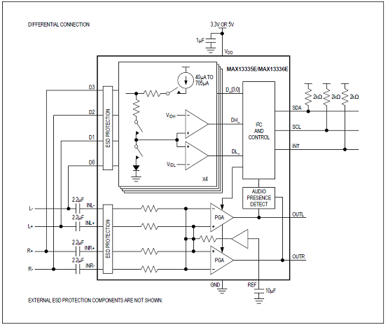 Each channel of the device features high common-mode rejection ratio (CMRR) (80dB), enabling the recovery of audio signals in the presence of large common-mode noise in automotive environments. An integrated programmable gain amplifier is adjustable from -14dB to +16dB (MAX13335E) and -22dB to +8dB (MAX13336E) with zero-crossing detection to provide an optimum output-signal level and limit zip noise. The external flexible diagnostic inputs can be configured to perform jack sense functions or to detect short-to-battery, short-to-ground, open load, and shorts between channels.